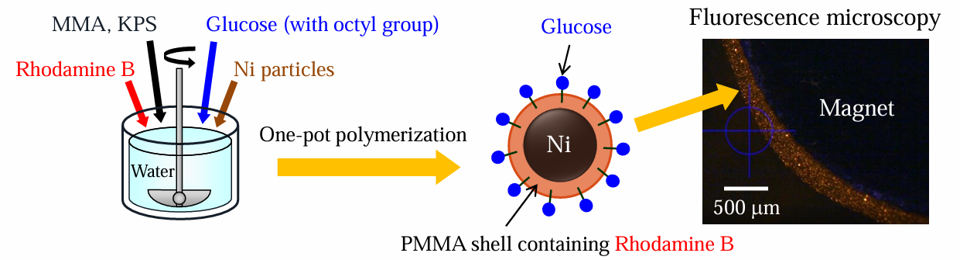 Fabrication of a sugar-immobilized fluorescent PMMA shell on a Ni core particle via soap-free emulsion polymerization.
