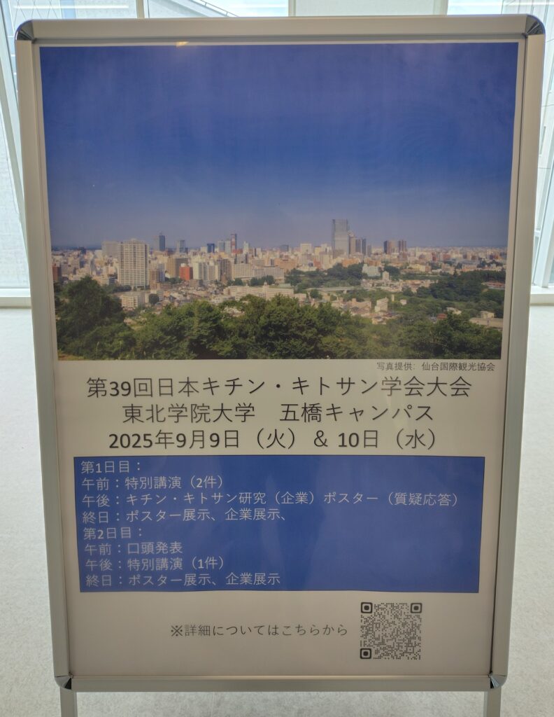 2025年9月9日(火)および10日(水)に東北学院大学五橋キャンパスで開催された第39回日本キチン・キトサン学会に参加しました。本研究室が関係する研究としては、1演題ずつの奨励賞受賞講演と口頭発表、ポスター発表を行いました(下記参照)。また、大会二日目には一関高専の戸谷一英先生の特別講演(キチンの前処理技術と有効利用)もあり、非常に有意義な時間となりました。