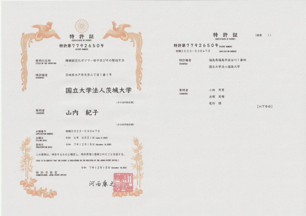 2026.01.06 茨城大学の山内紀子先生らと出願した特許公報が公開されました。 【特許番号】特許第7792650号【登録日】令和7年12月18日【発明の名称】糖鎖固定化ポリマー粒子及びその製造方法【出願番号】特願2023-530470【出願日】令和4年6月21日【国際出願番号】PCT/JP2022/024625【国際公開番号】WO2022/270482【特許権者】茨城大学、福島大学【発明者】山内紀子、小林芳男、永塚実稚、尾形慎