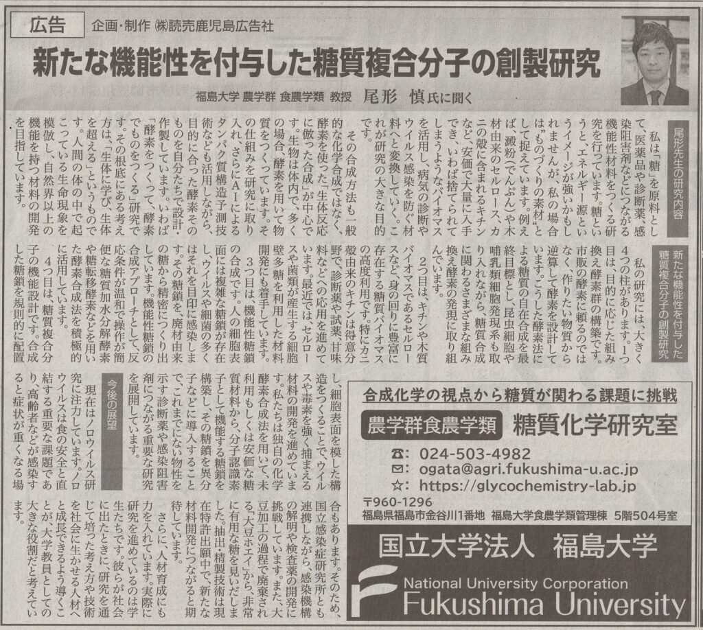 鹿児島読売新聞の記事型広告で研究室の取り組みを紹介頂きました。