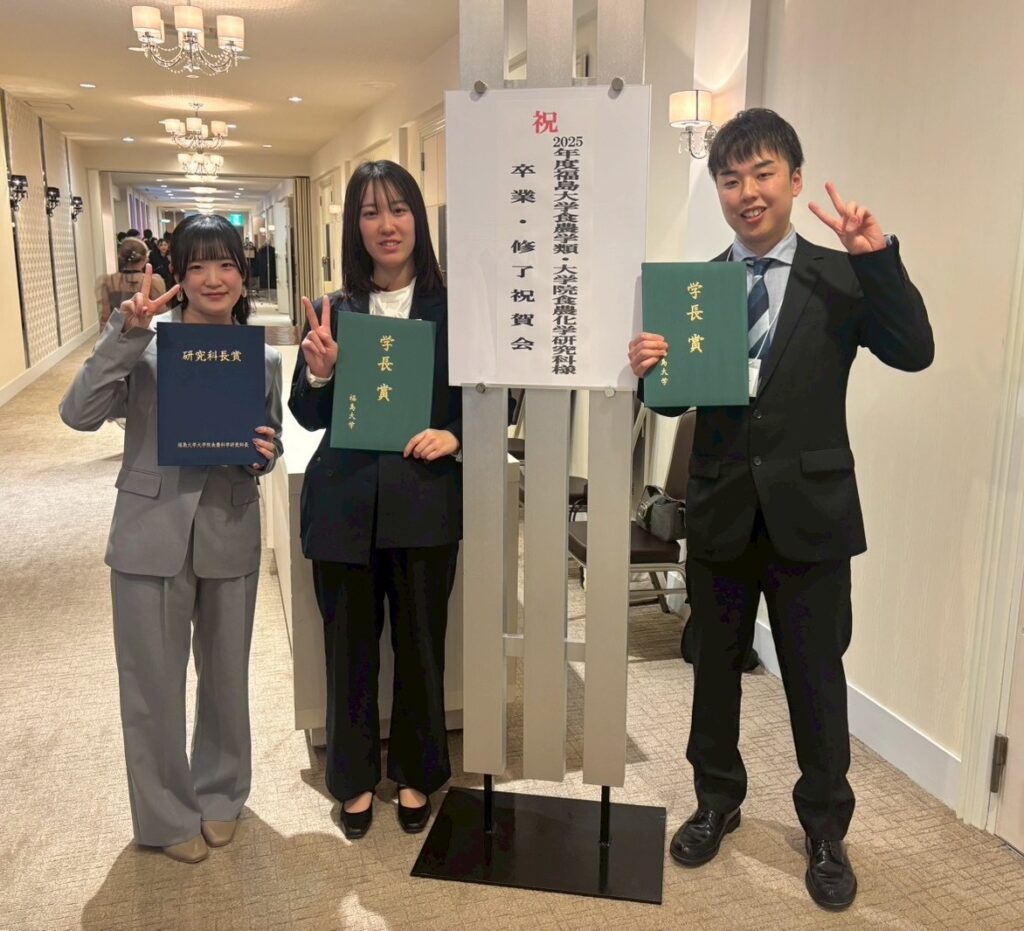 本研究室の吉川優花さん(修士2年生)が、令和7年度福島大学大学院食農科学研究科の研究科長賞を受賞しました。表彰式は2026年3月25日(水)にエルティ ウエディング・パーティ エンポリアムにて執り行われ、新田洋司研究科長より賞状および記念品が授与されました。先日の学長賞に引き続き、本研究室の同期3名全員が受賞するという大変喜ばしい結果となり、研究室としても非常に嬉しく思います。今回の受賞はもちろんのこと、皆さんが主体的に取り組んできた研究プロセスそのものが、研究室の後輩の皆さんにとって良い指針になるはずです。指導教員として、心より感謝申し上げます。3年間、本当にありがとうございました。